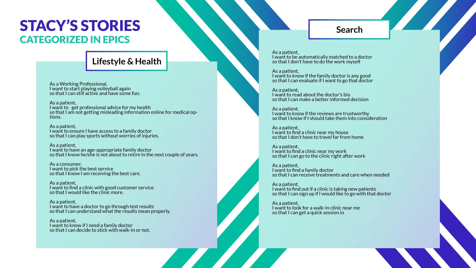 A series of user stories, categorized in epics, are curated to help define desired features and functions for users in a digital solution.